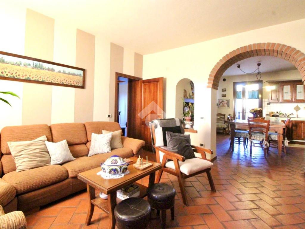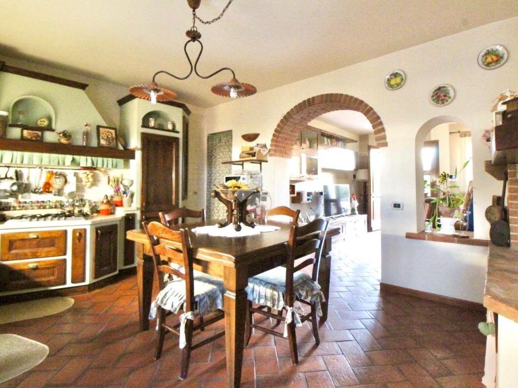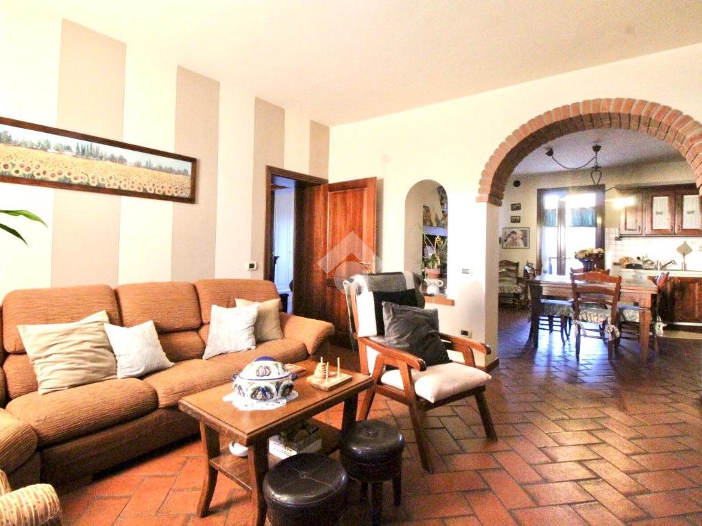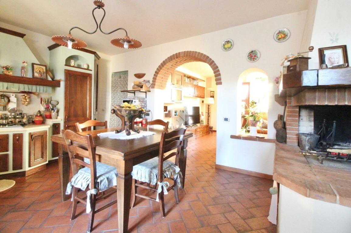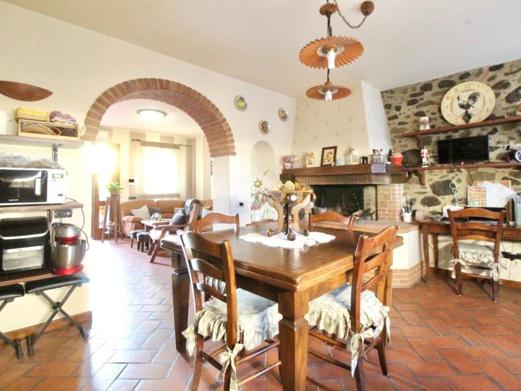 La zona giorno è composta da un soggiorno accogliente che si collega alla cucina attraverso un caratteristico arco in mattoncini, elemento che dona continuità agli ambienti e richiama lo stile rustico toscano.