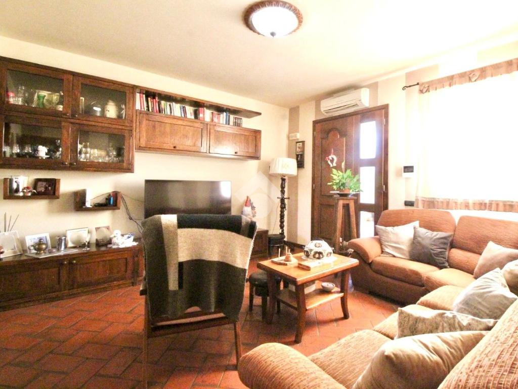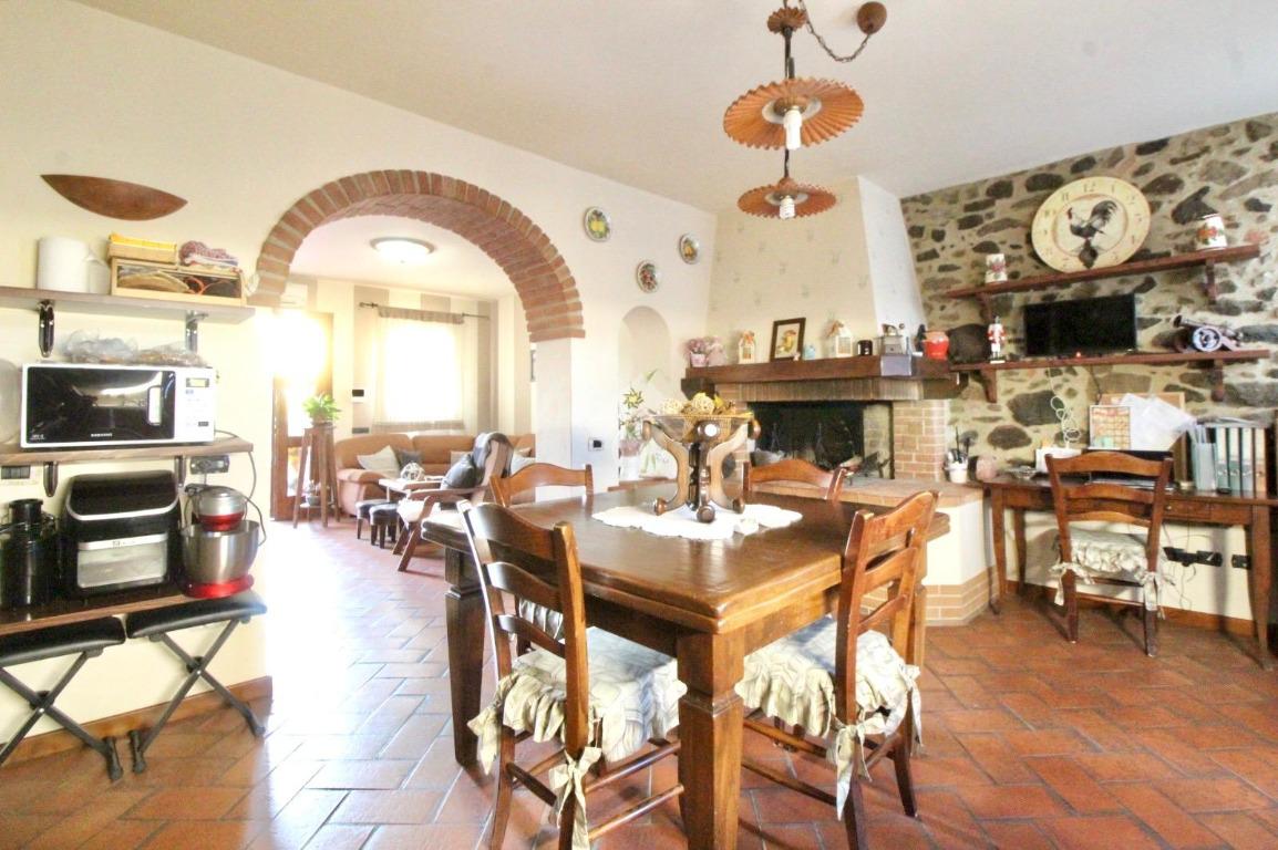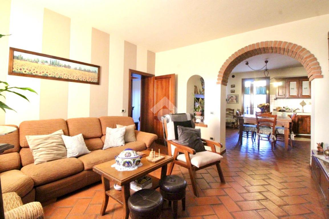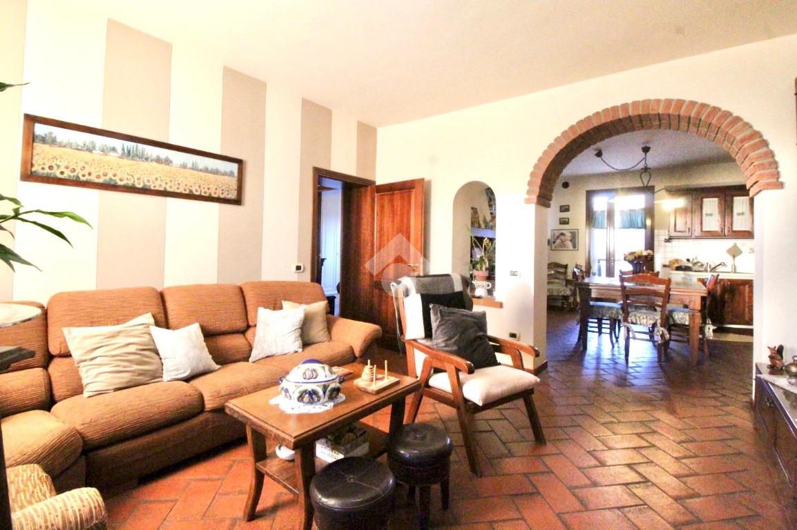 La zona giorno è composta da un soggiorno accogliente che si collega alla cucina attraverso un caratteristico arco in mattoncini, elemento che dona continuità agli ambienti e richiama lo stile rustico toscano.